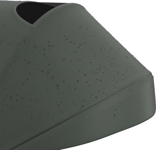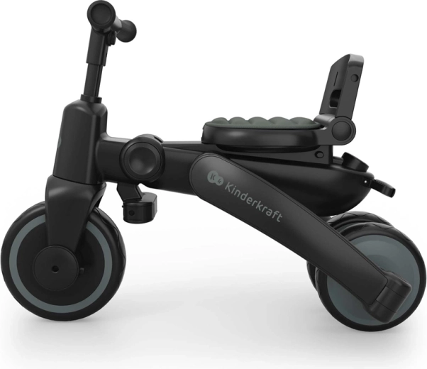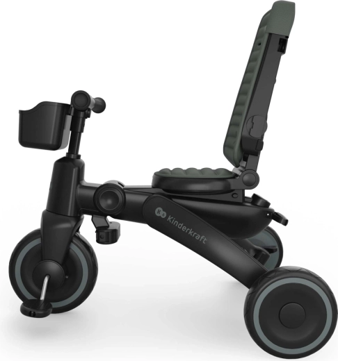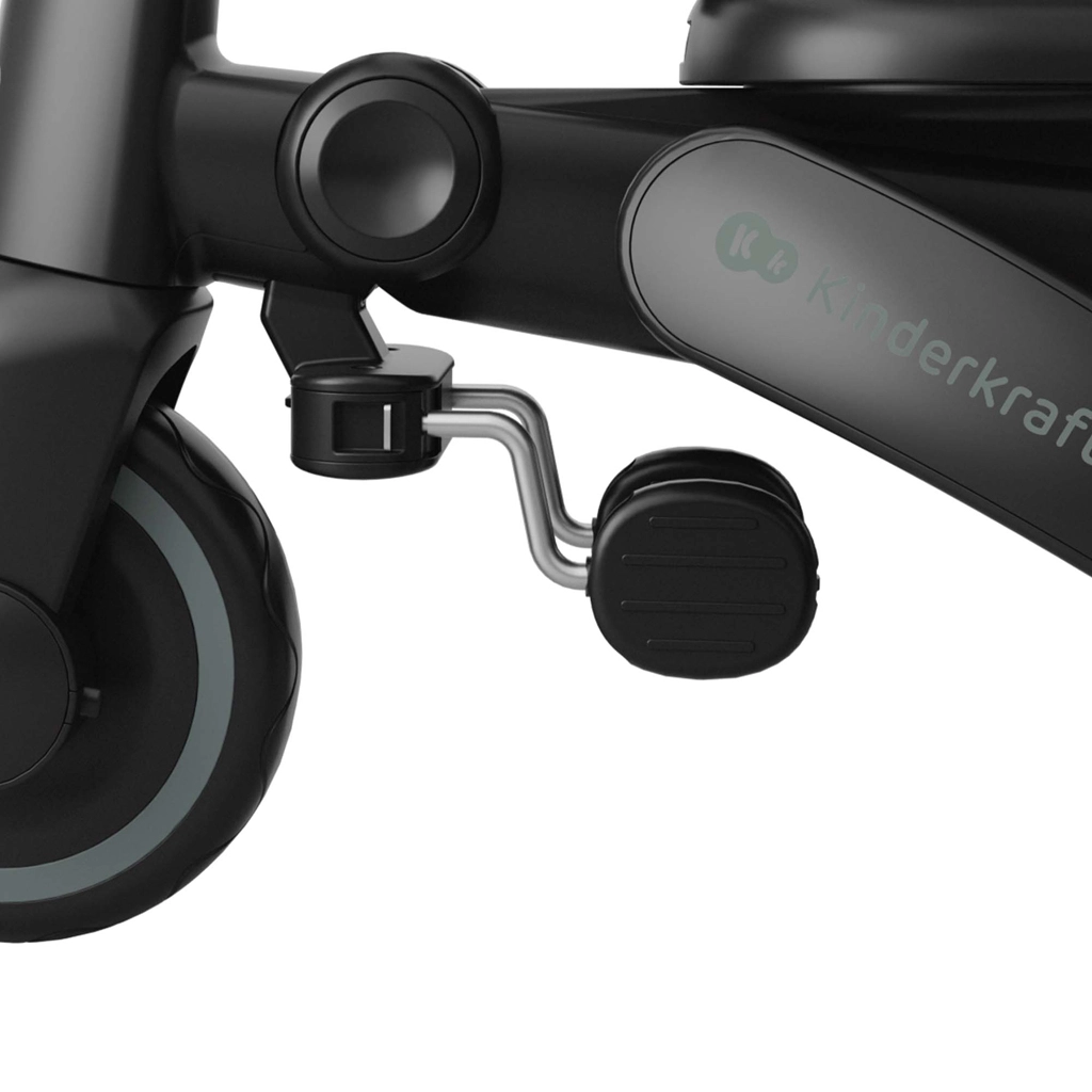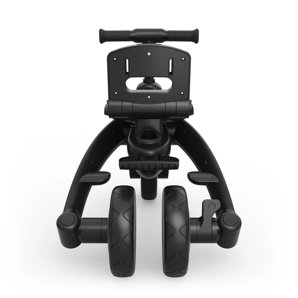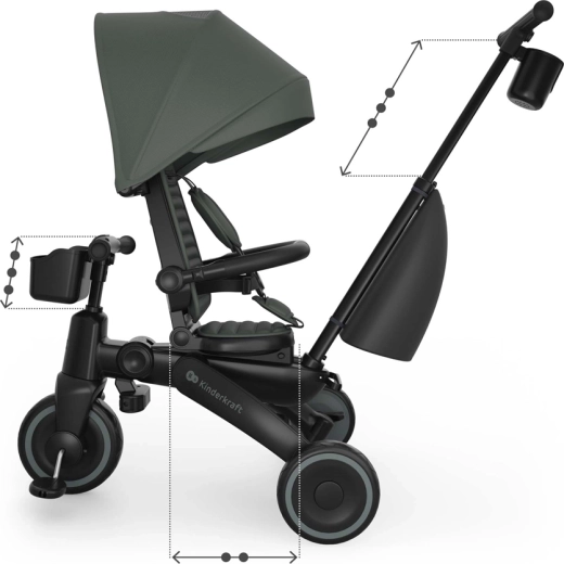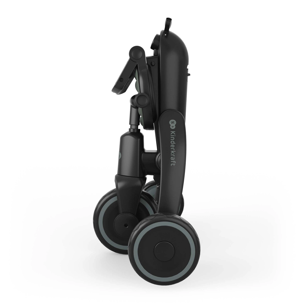 Het opvouwbare frame met dubbele veiligheidsvergrendeling zorgt voor snel en veilig opvouwen tot compacte afmetingen. De driewieler kan stabiel zowel verticaal als horizontaal worden opgeborgen – handig in huis, lift en kofferbak. De grote kap met UPF 50+-filter en waterafstotende coating beschermt tegen zon en lichte regen; het ventilatiepaneel en het peek-a-boo kijkvenster verbeteren de luchtstroom en het contact met je kind.