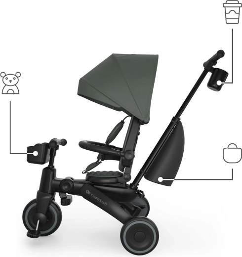 Voor zorgeloos rijden is er een centrale rem die beide achterwielen blokkeert, een telescopische ouderduwstang voor nauwkeurige besturing en soepel schakelen tussen training en zelfstandig rijden. De robuuste wielen met rubberprofiel kunnen stadsstoepen en parken aan, en praktische mandjes/tassen bieden ruimte voor spulletjes onderweg.
