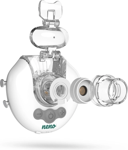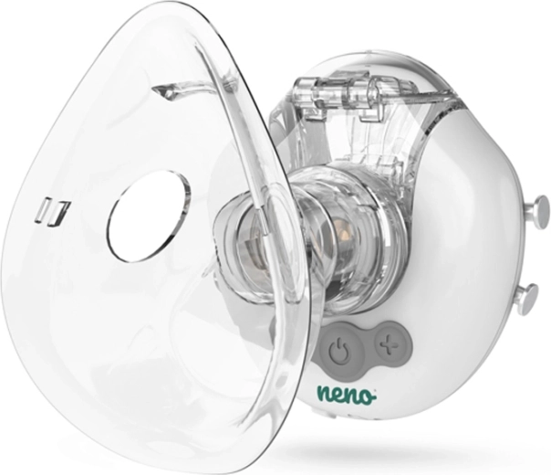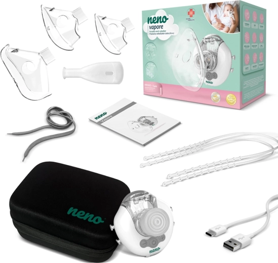De lichte en compacte inhalator Neno Vapore biedt draadloze werking, stille werking en drie snelheidsmodi voor comfortabel inhaleren waar dan ook. Dankzij MMAD <5 μm komt het medicijn diep in de lagere luchtwegen. In de verpakking vind je 3 maskermaten (pasgeborene, kind, volwassene) en een mondstuk, een grote 6 ml container voor het medicijn en een praktische reisetui.