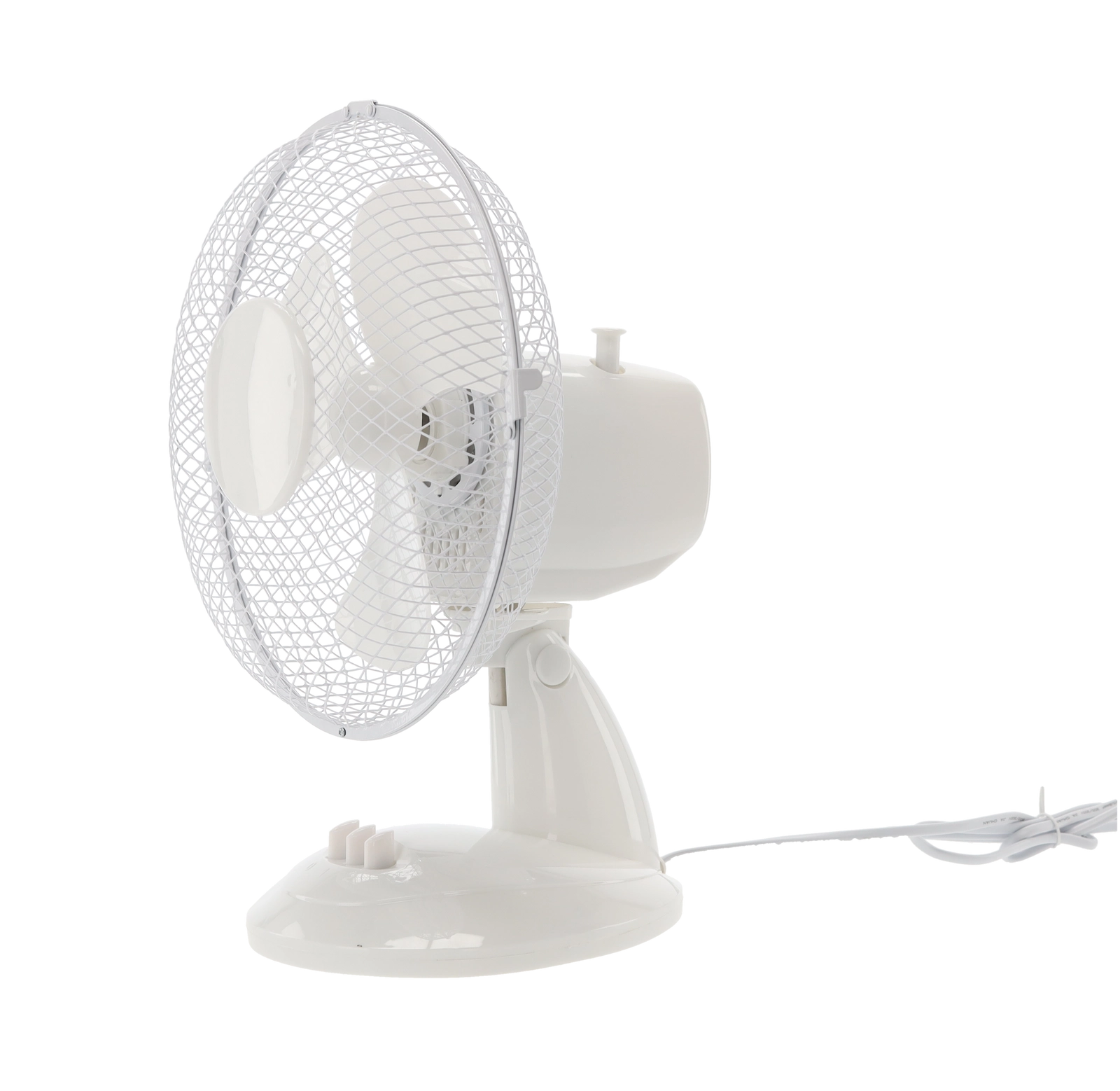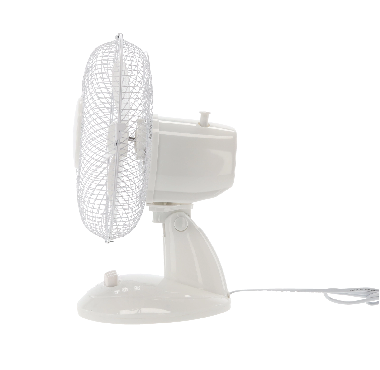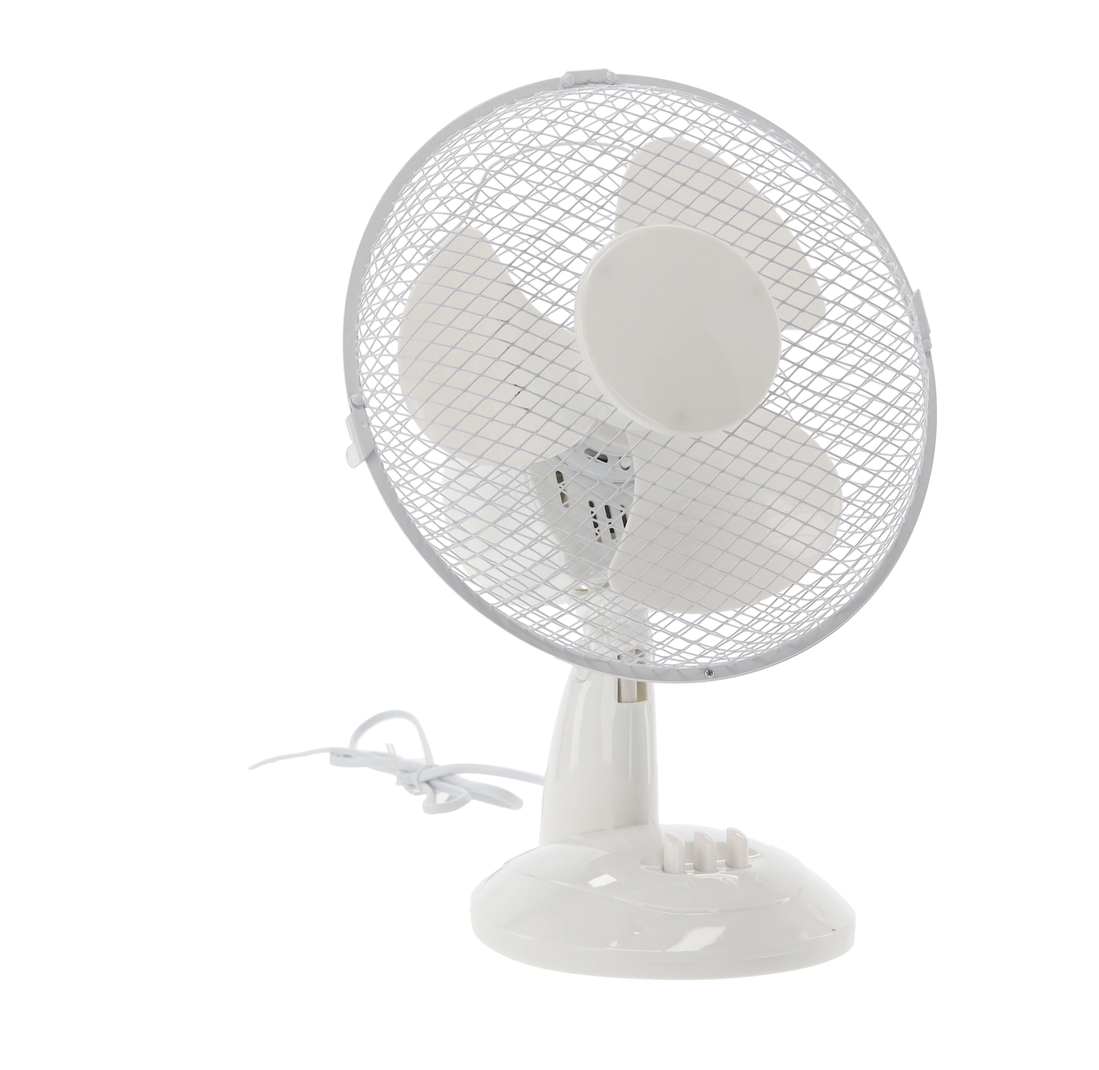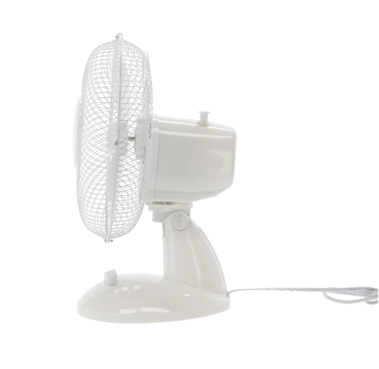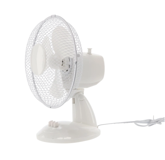 De duurzame kunststoffen driebladige waaier en het beschermrooster verhogen de veiligheid, terwijl de stabiele voet de ventilator stevig op zijn plek houdt, zelfs op kleinere oppervlakken. Het elegante witte design past in elk interieur en biedt snelle verlichting tijdens warme dagen.