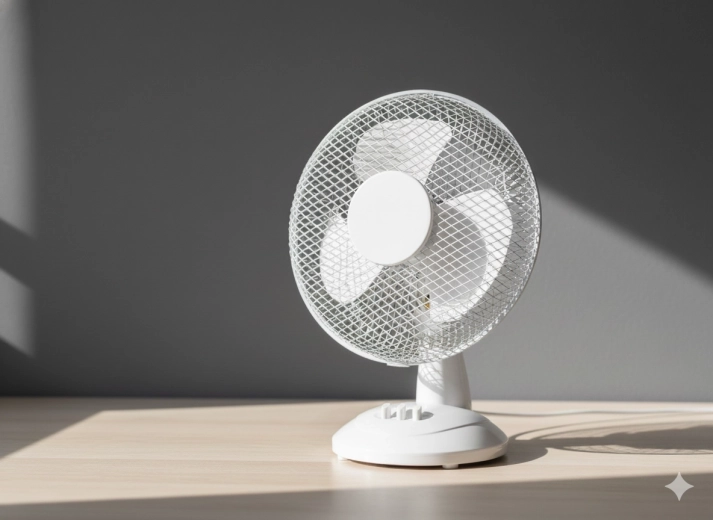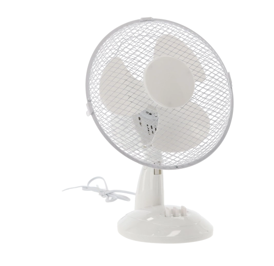 Driebladige waaier van duurzaam kunststof, beschermrooster en stevige voet voor dagelijks veilig gebruik.