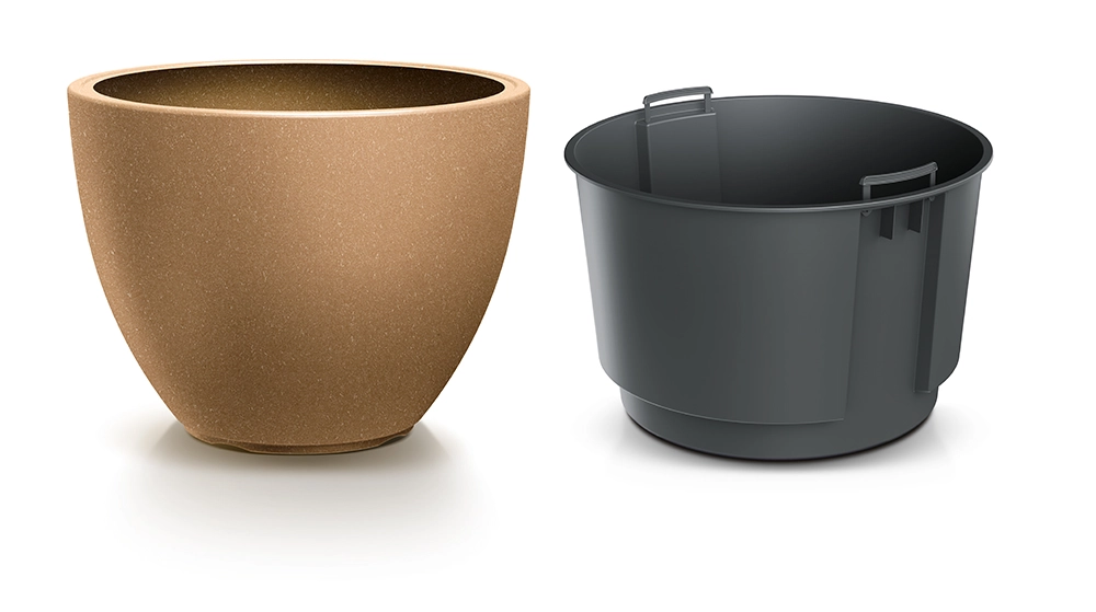 De set bevat een uitneembare inzet die planten, verpotten en bewateren vereenvoudigt. De lichte maar zeer stevige constructie maakt verplaatsen gemakkelijk, zonder risico op breuk. De vorm met een bredere diameter geeft planten voldoende ruimte voor een gezonde groei en stabiliteit.