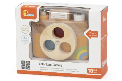 Ontdek speelse creativiteit met deze hoogwaardige houten camera met een kleurlens en een draaibare lens met rode, gele en blauwe filter. De realistische sluiterknop, draaibare bovenknop en achterspiegel prikkelen de fantasie en de zintuigen. Gemaakt van duurzaam beukenhout met gladde, afgeronde hoeken, ideaal voor kleine handjes. Geschikt vanaf 18 maanden.