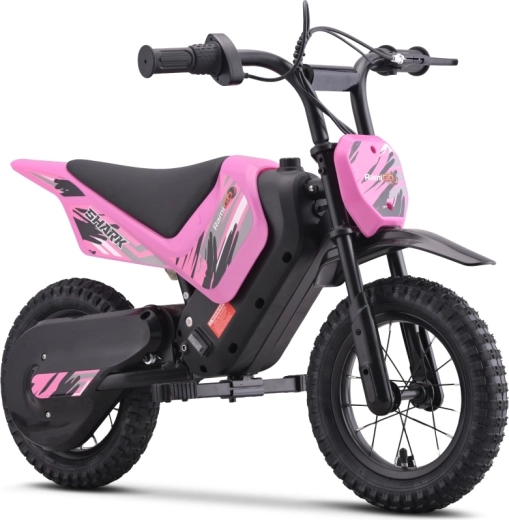 De stijlvolle elektrische kindermotor SHARK in het roze biedt veilige fun in de tuin en op verharde paden. Hij heeft een stevig, poedergecoat frame, opblaasbare offroad-banden met diep profiel en een topsnelheid tot 15 km/u. De aandrijving wordt verzorgd door een stille 150W elektromotor met kettingoverbrenging, met 2 snelheidsmodi en een handige batterijstatusindicator.