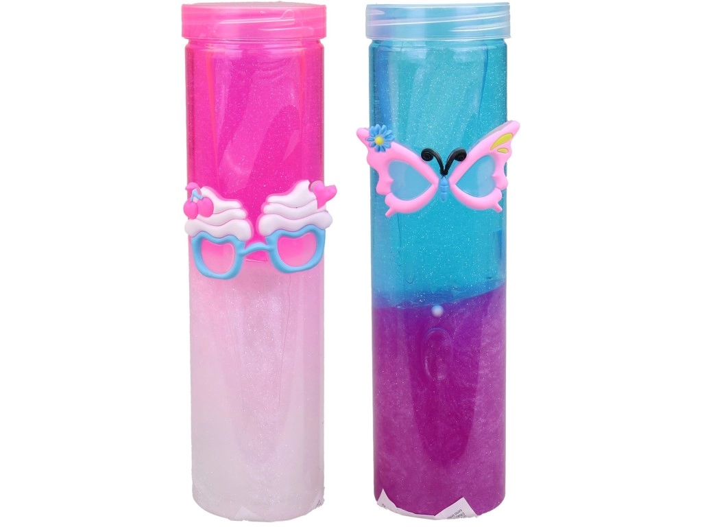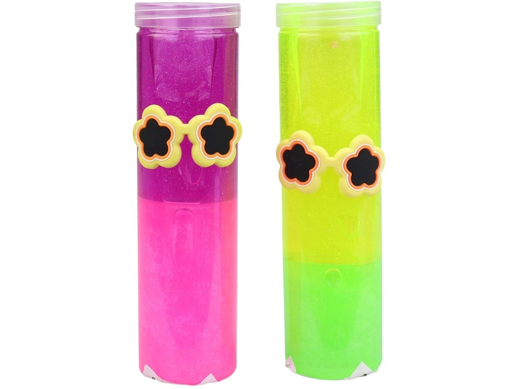 De praktische tube met een hoogte van ca. 19 cm en een diameter van 5,5 cm voorkomt uitdroging en houdt de slijm schoon. Sommige varianten zijn versierd met kleine clips en motieven (bijv. bril, vlinder, bloemetje), wat het tot een nog aantrekkelijker cadeau maakt. Ideaal als kleine attentie, beloning of vermaak voor onderweg.