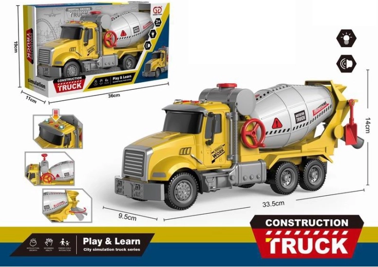 Deze gele kinderbetonmixer bootst een echte bouwmachine natuurgetrouw na. Duw hem een stukje naar voren en dankzij de frictieaandrijving rijdt hij zelf verder. Authentieke geluiden van het mengen van cement en bouwplaatsgeluiden samen met lichteffecten nemen kinderen mee in de bouwwereld en stimuleren hun fantasie.