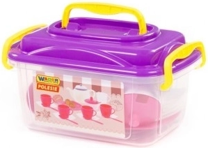 - Theepot; suikerpot met deksel; melkkannetje; 4 kopjes; 4 schoteltjes; 1 bordje; 5 theelepels