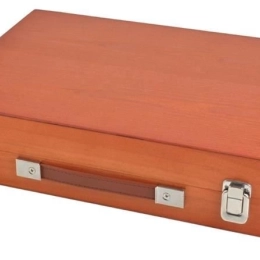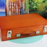 Stabiele en stijlvolle koffer met een afwerking van gepolijst hout biedt ruimte voor veilige opslag van alle hulpmiddelen.