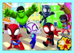 Ontdek de kleurrijke wereld van superhelden met de 4-in-1 puzzelset met motieven van Spidey en zijn vrienden. Elke van de vier puzzels heeft een verschillend aantal stukjes, zodat kinderen hun vaardigheid en zelfvertrouwen stap voor stap kunnen vergroten. Na het leggen ontstaan vier afbeeldingen met afmetingen 285 × 205 mm, ideaal voor kinderhanden.