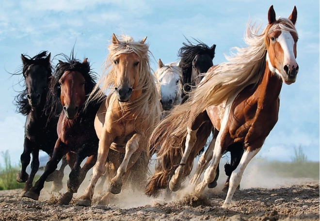Geniet van een puzzel die, eenmaal voltooid, een adembenemend tafereel van galopperende paarden vastlegt. De afmetingen van het eindresultaat zijn 68 x 48 cm, ideaal voor het weergeven van de details van deze dynamische scène.