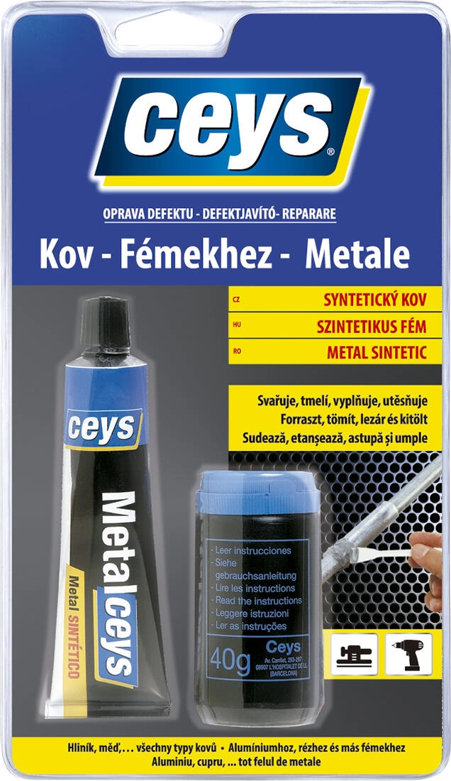 Tweecomponentenplamuur CEYS met metaalvulling voor snelle en duurzame reparaties van metalen. Koudlassen (bijv. aluminium, koper), afdichten, verbinden en scheuren opvullen. Vormt een antiroest-beschermlaag, is bestand tegen zuren, detergenten en mineralen en kan na uitharding geschuurd, geboord, gepolijst en geverfd worden.