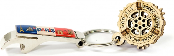 Lichte houten hanger met opening voor een sleutelhanger – draai aan het ene wiel en het andere draait vanzelf mee. Een stijlvolle accessoire voor sleutelbos of rugzak.