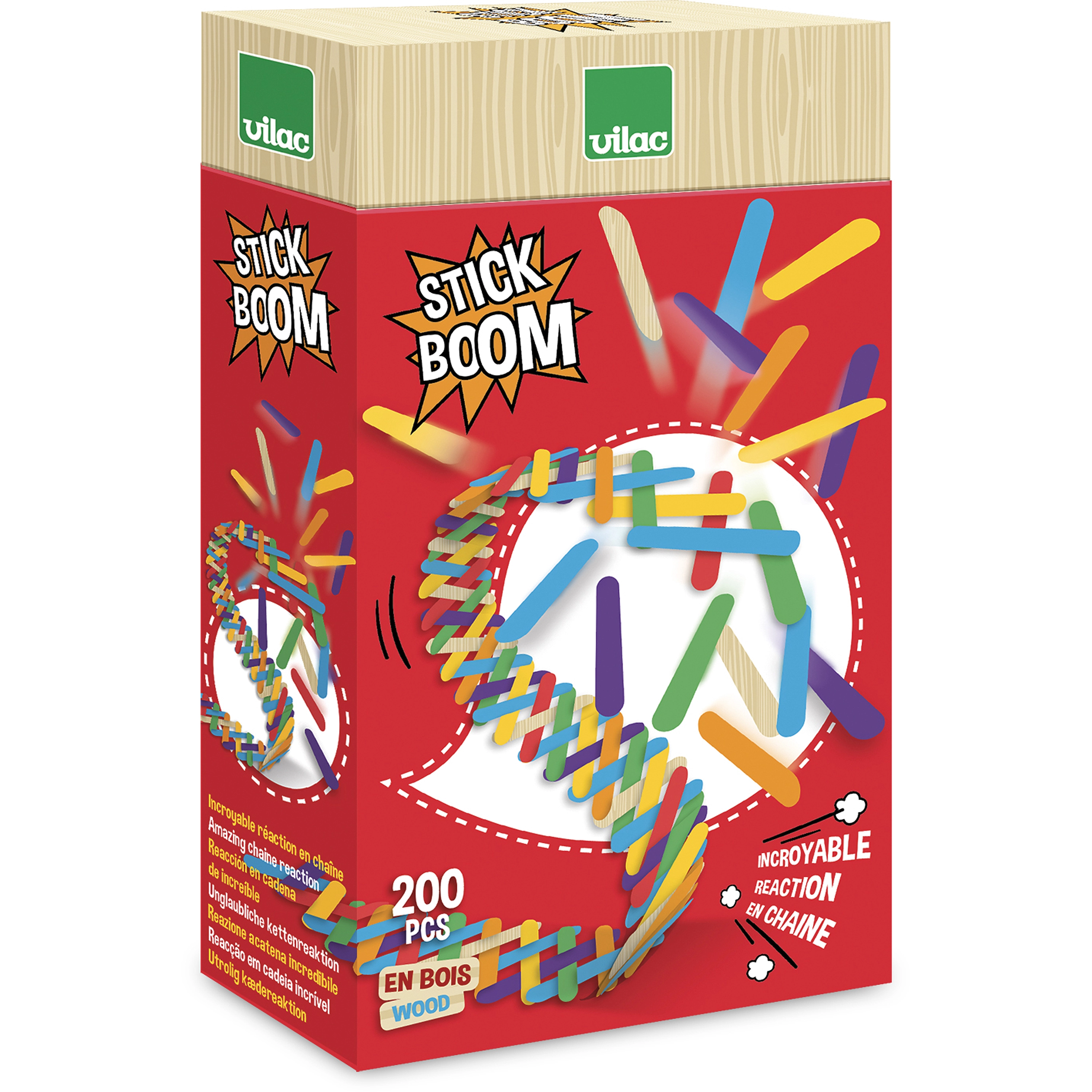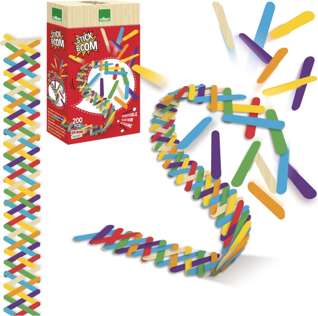 Vilac Stick Boom is een creatieve bouwset voor kinderen vanaf 6 jaar, die eenvoudige houten onderdelen verandert in een adembenemende show. Leg de kleurrijke stokjes in een gespannen structuur en zie hoe ze na het loslaten veranderen in een snel domino-effect. Ideaal voor plezier thuis en op school.