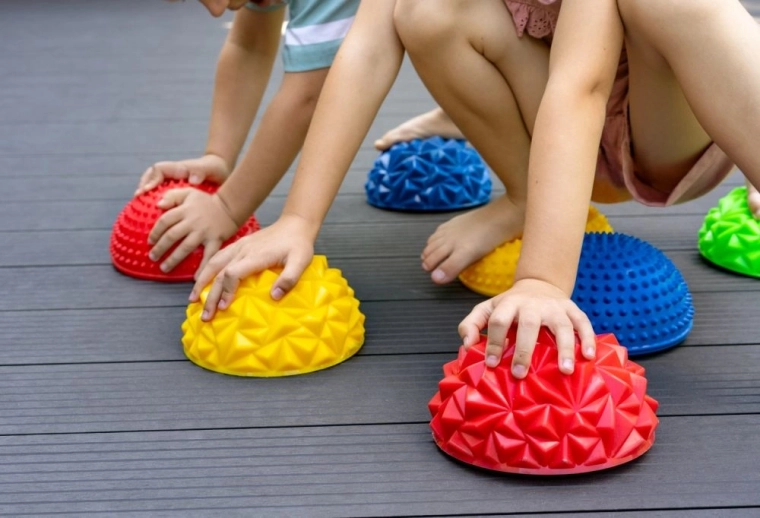 Dichte massagenoppen activeren receptoren op voetzolen en handpalmen, ondersteunen de bloedsomloop en verhogen de proprioceptie voor beter evenwicht en zelfverzekerde beweging.