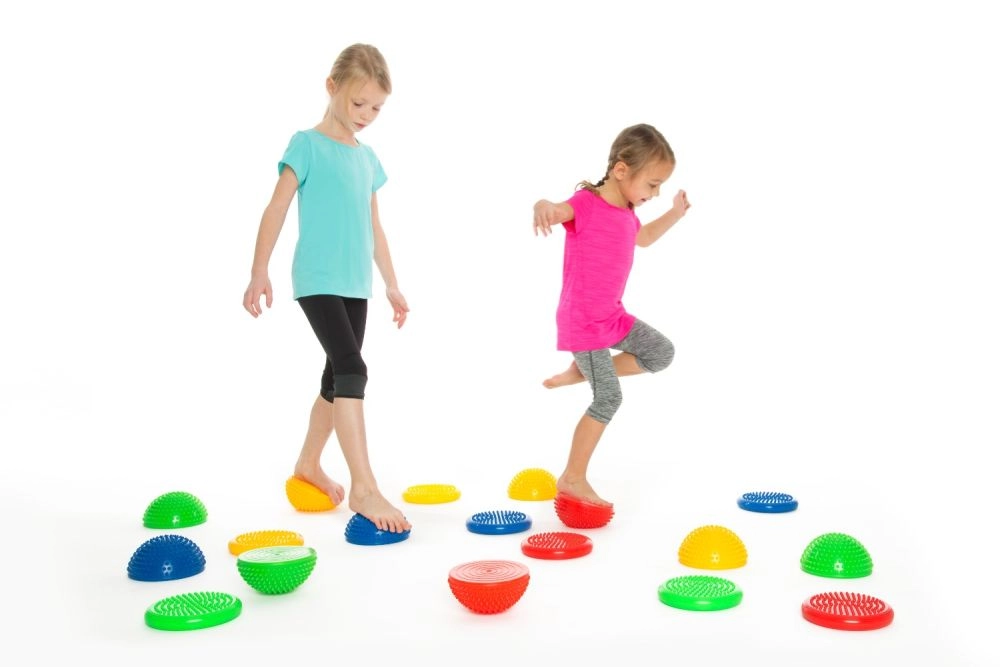 Ontdek een leuke manier om evenwicht, stabiliteit en zintuiglijke waarneming te verbeteren. Deze compacte sensorische halve bollen met een diameter van 16 cm en antislip massagenoppen zijn ideaal voor kinderen en volwassenen. Gebruik ze voor coördinatietraining, het versterken van de core en actieve voetmassage – thuis, in de kleuterklas, in de gymzaal en bij fysiotraining.
