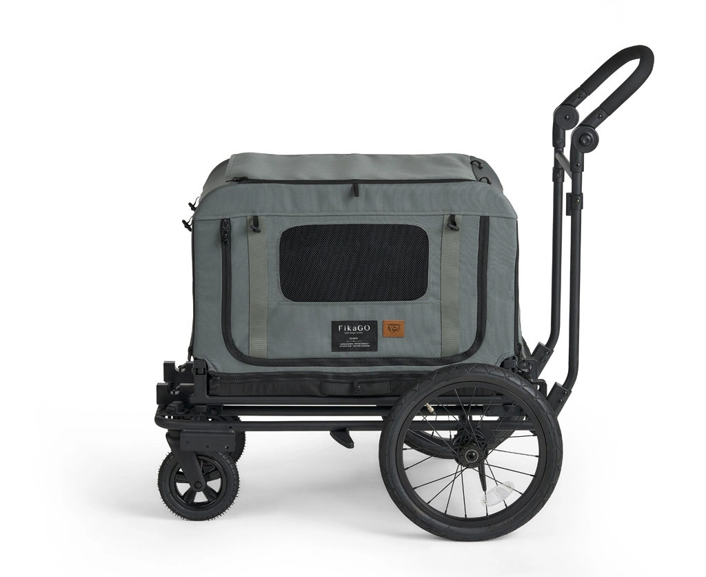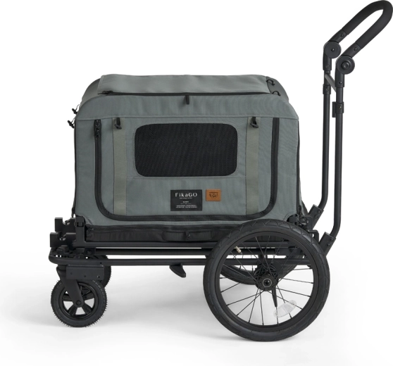 De modulaire hondenwagen Fikago King & Queen S combineert een stevige en veilige ruimte met een soepele rit en hoog draagvermogen. De opvouwbare kennel Queen met een duurzaam aluminium frame biedt rust en comfort voor de hond, terwijl het King-chassis met geveerde wielen en luchtbanden zowel stad als licht terrein aankan. Ideaal voor middelgrote en grote honden, senioren, huisdieren met gevoelige gewrichten of in revalidatie. Kan worden uitgebreid met een fietskoppeling voor langere tochten.
