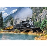 De puzzel toont een historische locomotief die door een prachtig berglandschap rijdt. Het betoverende beeld is ideaal voor liefhebbers van treinen en landschappen.