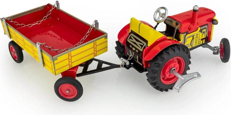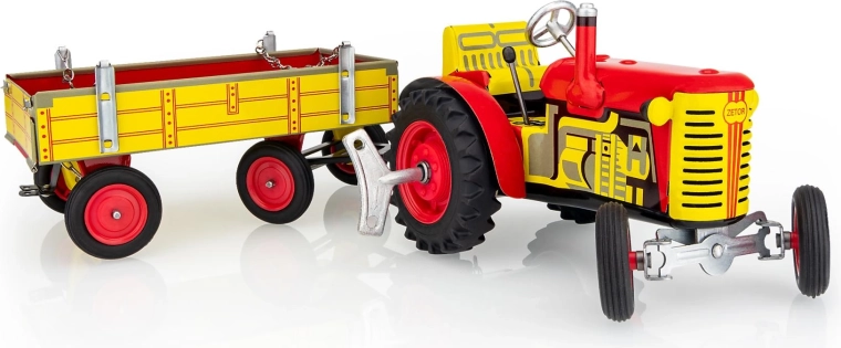 Het metalen model van de ZETOR-tractor met aanhanger van het merk KOVAP zal zowel kleine als grote techniekliefhebbers blij maken. Aandrijving wordt verzorgd door een opwindsysteem met sleutel, met een werkende versnellingsbak met drie versnellingen vooruit en achteruit, sturen met het stuur en een handrem. Schaal 1:25, lengte ca. 28 cm.