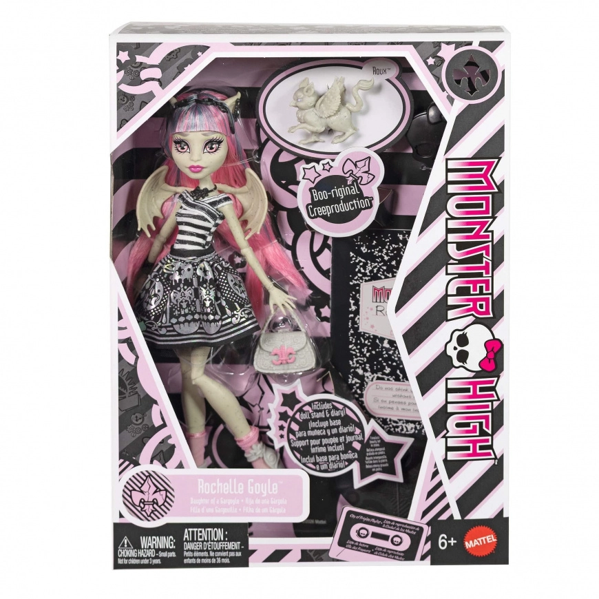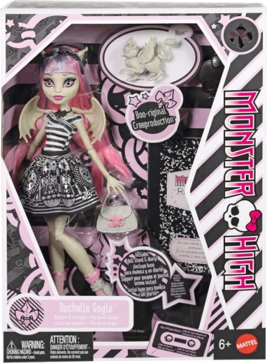 Keer terug naar de wereld van Monster High met de comeback van het cultpersonage Rochelle Goyle. De pop valt op met een zwart-witgestreepte top, een metallic minirok en roze accenten die passen bij haar lange roze haar. Gedetailleerde make-up, accessoires en de iconische vleugels completeren de unieke “Scaris”-stijl.