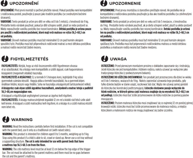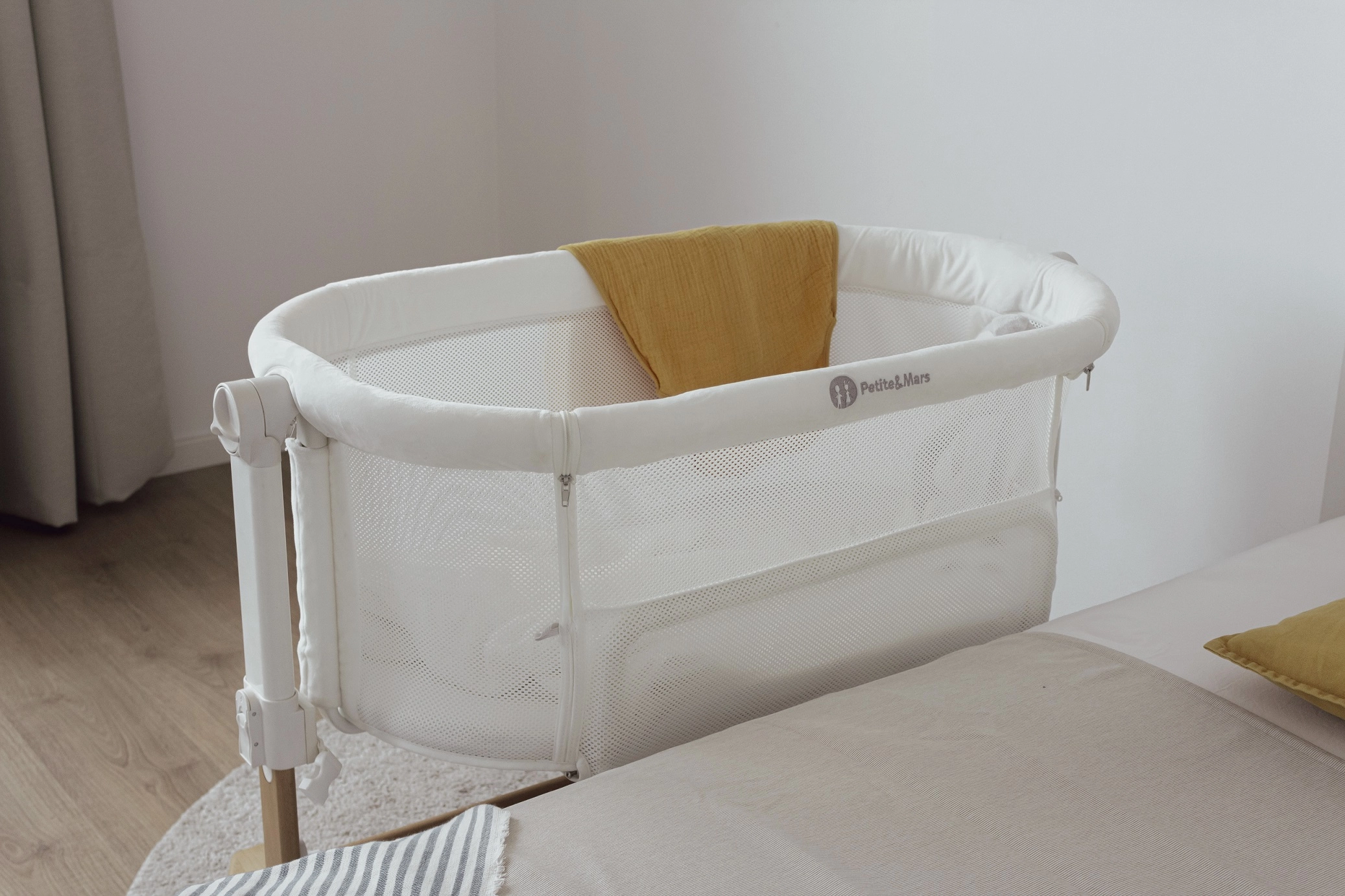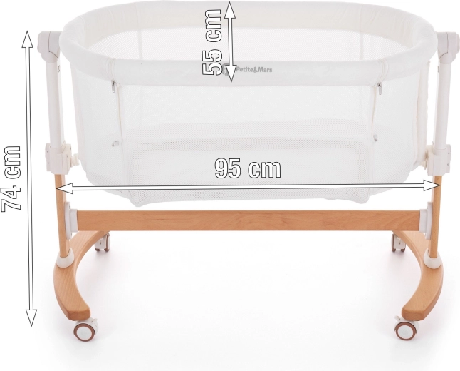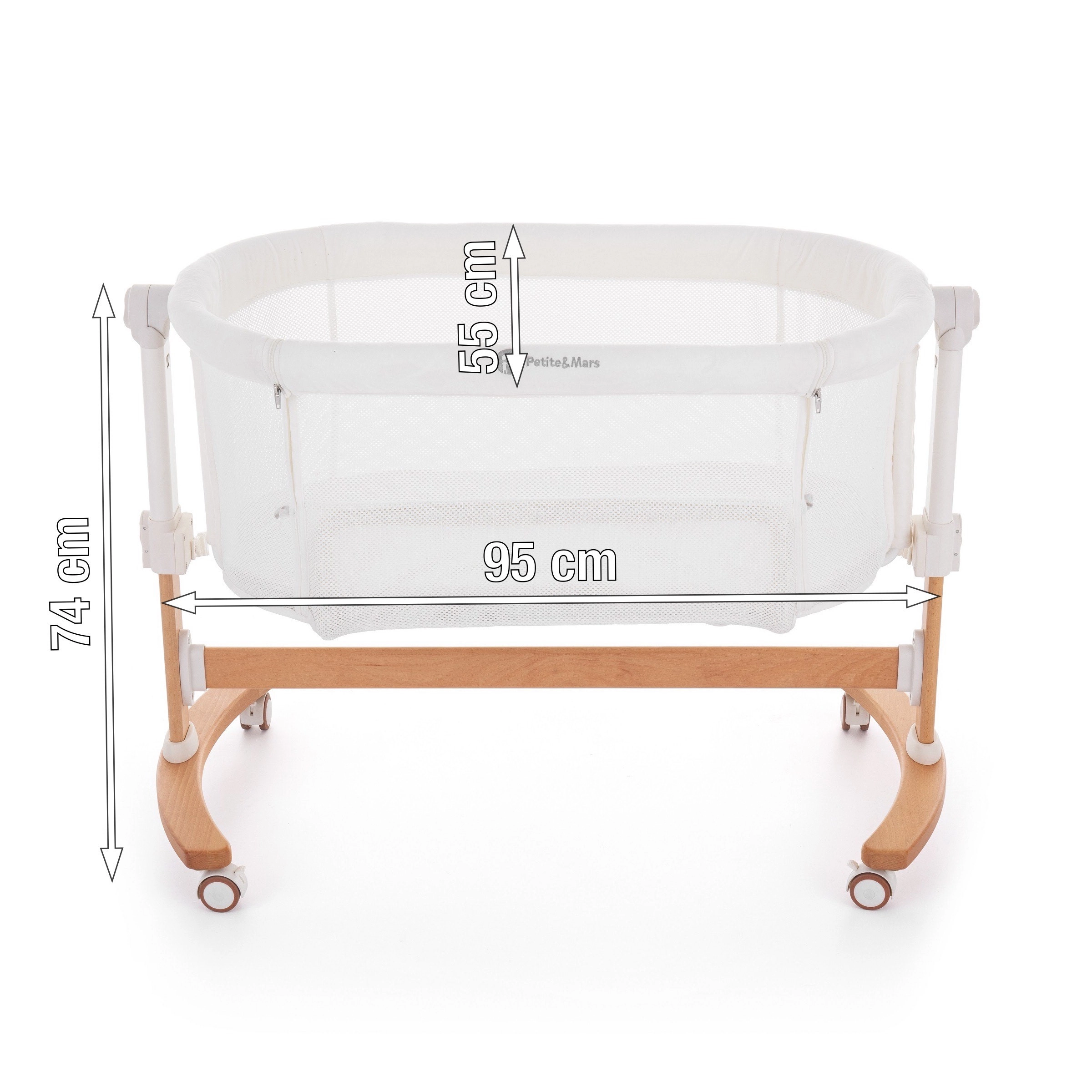 De hoogte is eenvoudig in te stellen op 5 standen, zodat het perfect aansluit op het ouderlijk bed (ideaal voor een matrasbovenrand van 56,5–68,5 cm). De basis met wielen en remmen maakt verplaatsen door het huis gemakkelijk. Voor het comfort van de baby is een matras met wasbare hoes inbegrepen. Het hele bedje kan worden ingeklapt en opgeborgen in de meegeleverde tas, ideaal voor op reis.