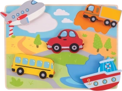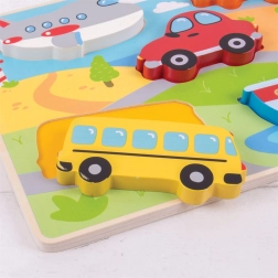Leuke houten inlegpuzzel met vervoersmiddelen voor de allerkleinsten. Bevat 5 grote stukjes met knopjes, die kinderen gemakkelijk in de juiste uitsparingen plaatsen. Ondersteunt fijne motoriek, coördinatievaardigheden, leren van vormen en kleuren en woordenschatontwikkeling. Gemaakt van hoogwaardig hout en voldoet aan de Europese veiligheidsnormen.
