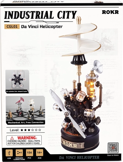 Ontdek de magie van techniek en geschiedenis met een 3D bouwpakket geïnspireerd op de visies van Leonardo da Vinci. Dit gedetailleerde model biedt een functionerend mechanisme met tandwielen, zuigers en een propeller, een 6-cilinder radiale “motor” en dubbele spiraalvormige vleugels (helix) die lift simuleren. De sfeer wordt versterkt door LED-verlichting en een stoom-effect, waardoor de puzzel een originele decoratie en een fantastisch cadeau voor techniekliefhebbers wordt.