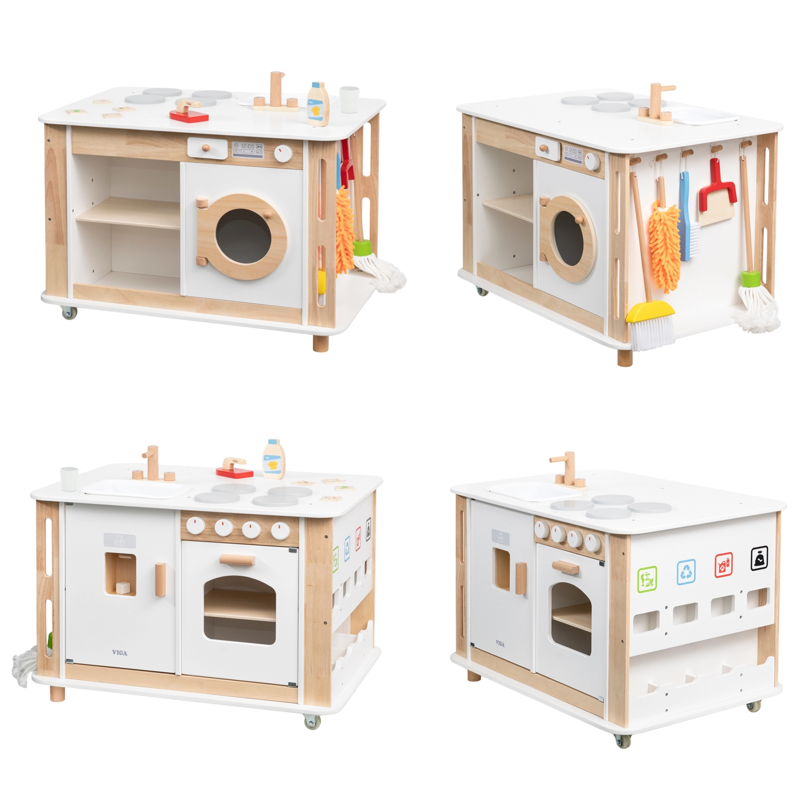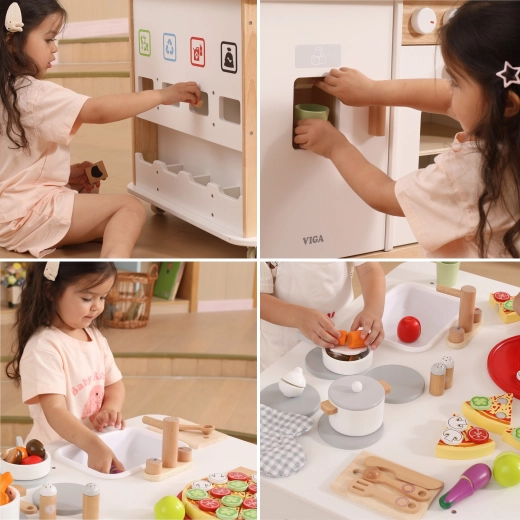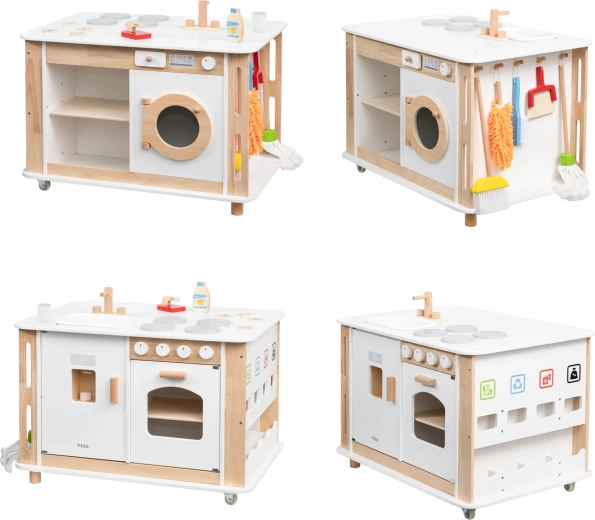 Dit houten 3-in-1 thuiscentrum van Viga tovert de kinderkamer om tot een levendige omgeving vol rollenspel van alledaagse activiteiten. Kinderen kunnen koken op het fornuis met draaiknoppen, bakken in de oven, de was doen in de “wasmachine”, afwassen in de gootsteen en leren afval scheiden met behulp van kleurrijk gemarkeerde onderdelen. Dankzij de twee zwenkwielen is het hele station eenvoudig te verplaatsen en ideaal voor samen spelen.