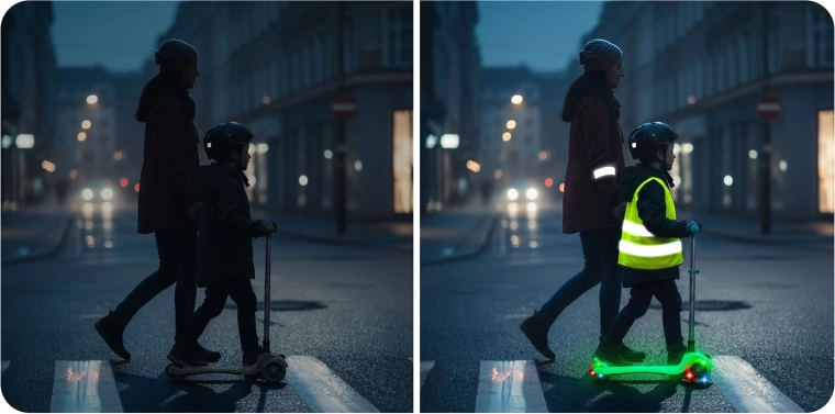 De voetplaat laadt overdag op en licht in het donker op, en de gekleurde LED-wielen met dynamo branden tijdens het rijden – zonder batterijen, voor betere zichtbaarheid en extra rijplezier.