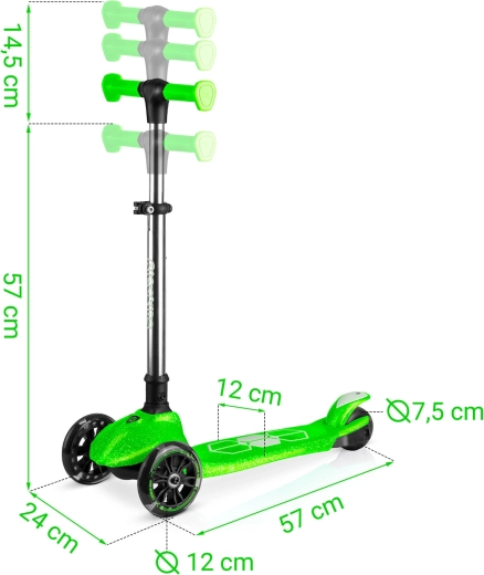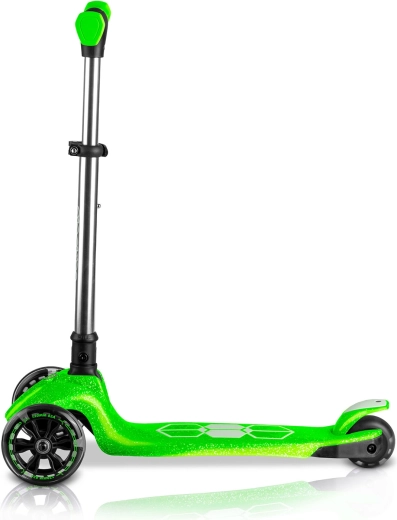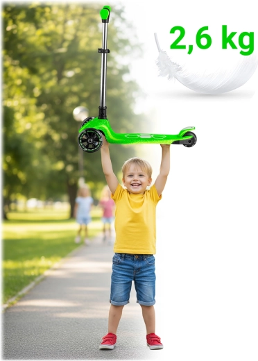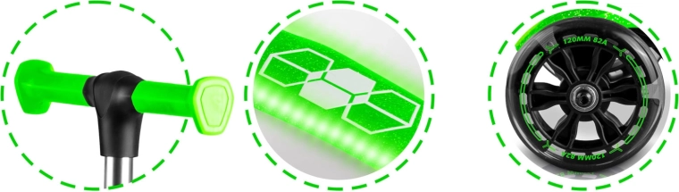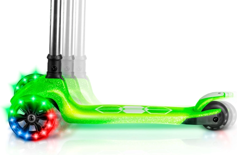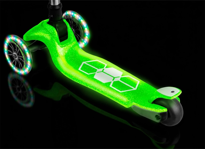 Voor de veiligheid zorgen een antislip deck, een effectieve achterste voetrem en lichtgevende LED-wielen met dynamo, aangevuld met LED-onderverlichting van het deck voor betere zichtbaarheid bij schemer. De in hoogte verstelbare aluminium stuurstang maakt het mogelijk de step aan te passen aan de groei van het kind, zodat hij meerdere seizoenen meegaat.