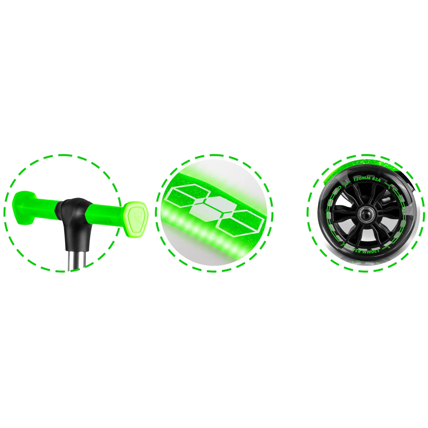 Geïntegreerde LED’s in de voorwielen en in het deck branden automatisch tijdens het rijden dankzij een dynamo. Kinderen zijn beter zichtbaar en het rijden is nog leuker.