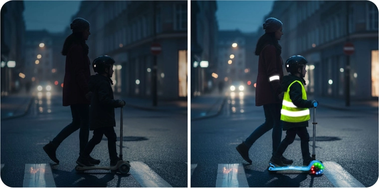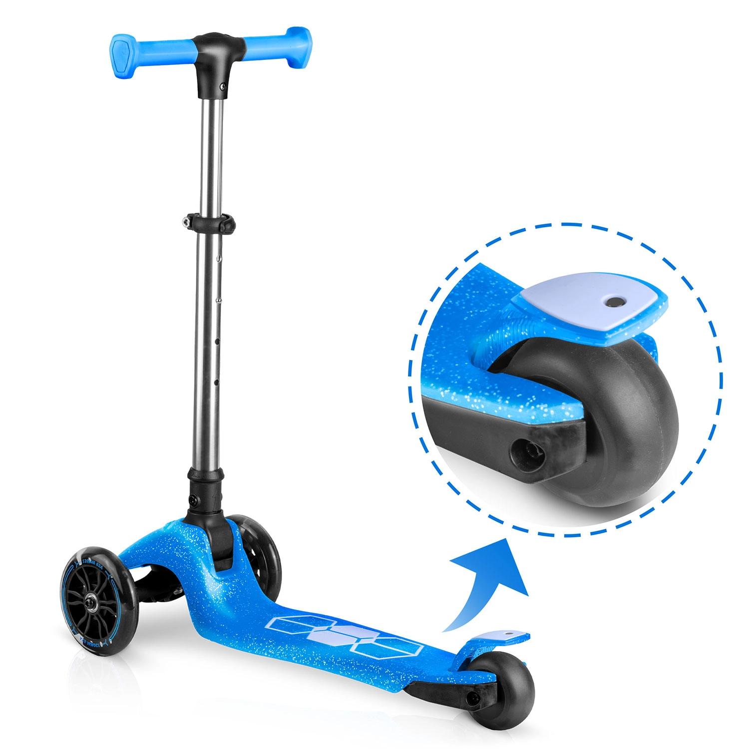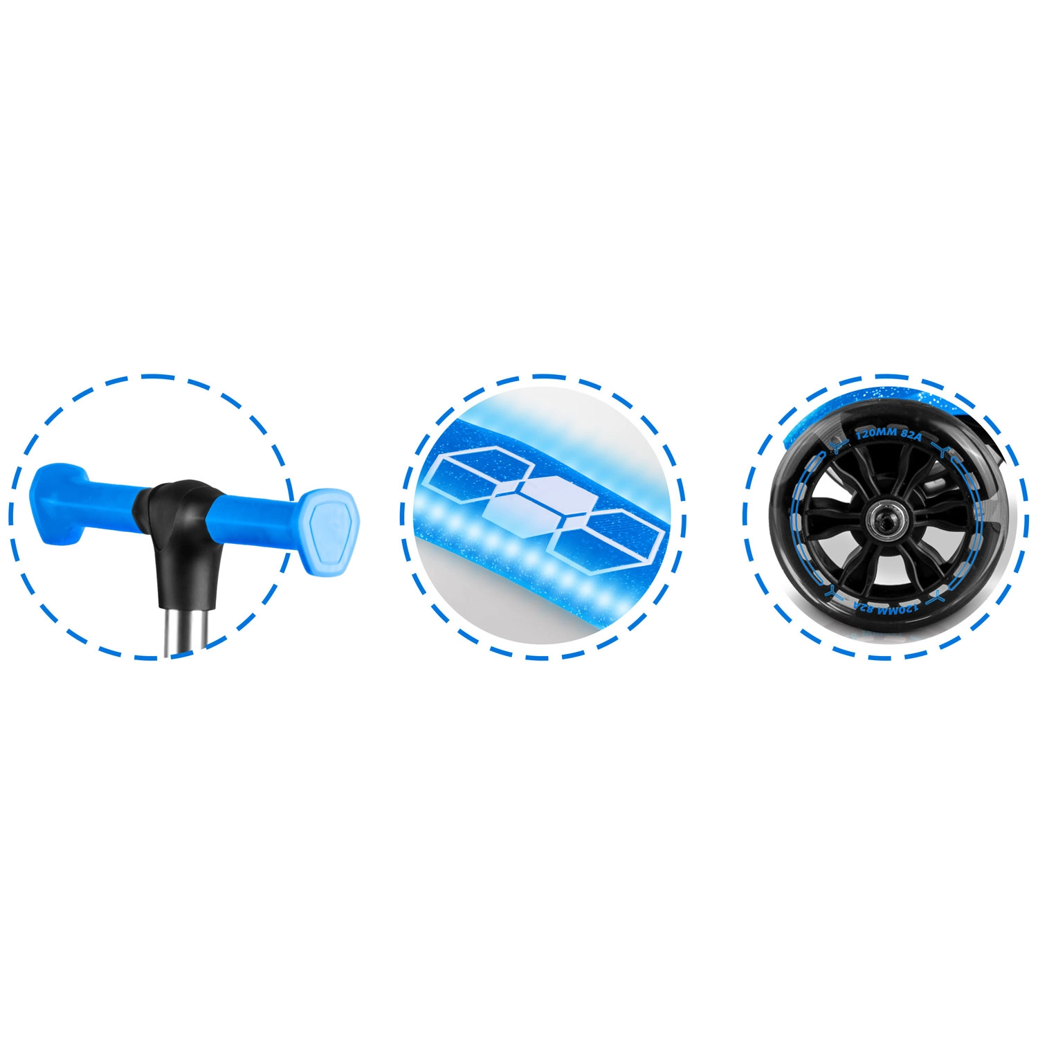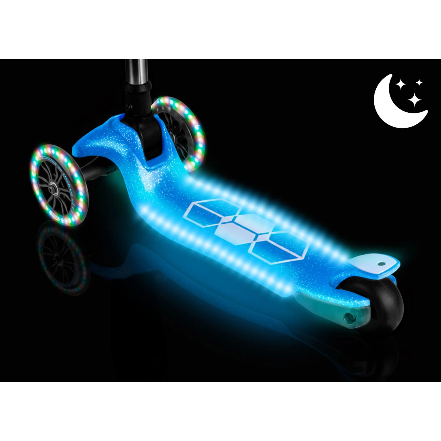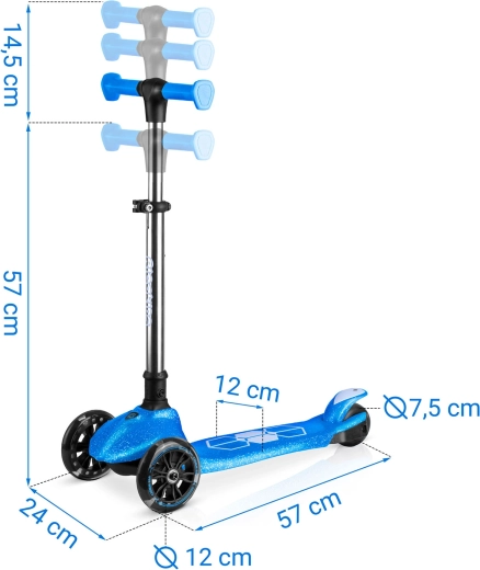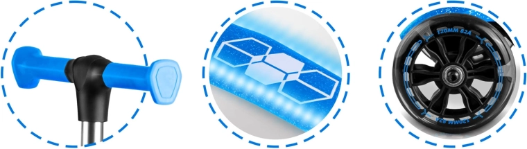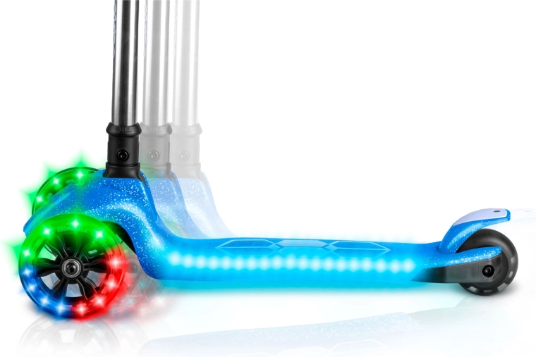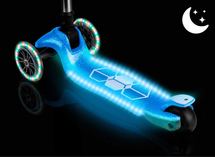 De geïntegreerde LED-verlichting in het deck en de lichtgevende voorwielen met dynamo laten elke rit stralen en verhogen de zichtbaarheid in schemerlicht. Het verstelbare aluminium stuur groeit makkelijk mee met het kind, zodat de step meerdere seizoenen meegaat. De robuuste constructie is ontworpen voor dagelijks gebruik en voldoet aan de CE-certificering en EN71-1/2/3.