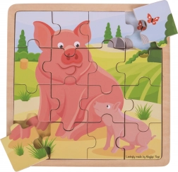 Schattige houten puzzel met een motief van een varkentje en een biggetje, ideaal als eerste puzzel voor kinderen vanaf 2 jaar. Bevat 16 robuuste stukjes die in een frame met dezelfde achtergrond worden gelegd voor makkelijker oriënteren. Grote stukjes liggen goed in kleine handjes en het puzzelen stimuleert motoriek, concentratie, fantasie en woordenschat. Gemaakt van hoogwaardig hout uit verantwoorde bronnen en voldoet aan de Europese veiligheidsnormen.