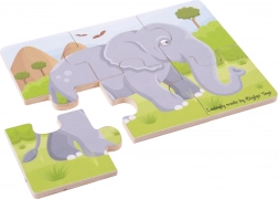 De set bevat 3 legpuzzels met thema’s van een leeuw, zebra en olifant – ideaal voor stapsgewijs leren en gevarieerd spel.