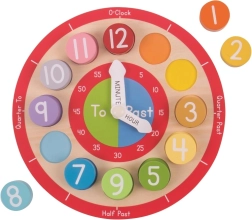 De klok heeft een bewegende minuten- en uurwijzer, een overzichtelijke indeling in minuten en duidelijke markering van delen van het uur (o’clock, quarter past, half past, quarter to) voor het gemakkelijk begrijpen van “kwart”, “half” en “driekwart”. Het speelgoed is gemaakt van verantwoord verkregen hout en voldoet aan de huidige Europese veiligheidsnormen.