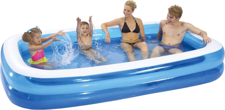 Dit rechthoekige opblaaszwembad biedt de perfecte combinatie van eenvoudige installatie, duurzaamheid en aantrekkelijk design. Ideaal voor in de tuin of op het terras, waar het zorgt voor snelle verfrissing en leuk waterspel voor kinderen.