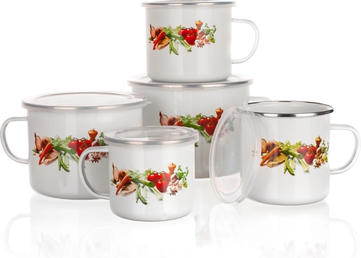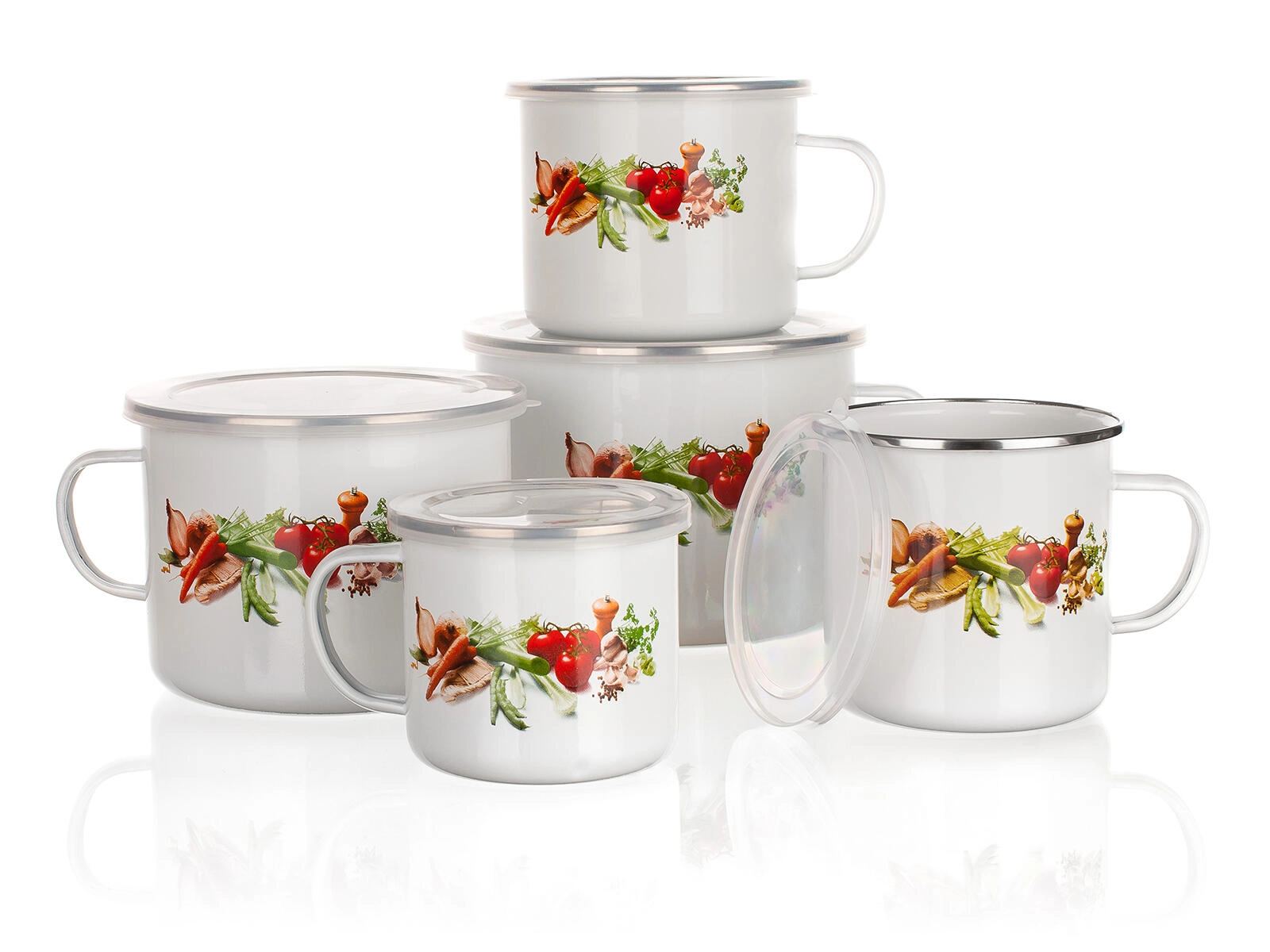 Geëmailleerde mok met groentedecor 0,7 l met kunststof deksel