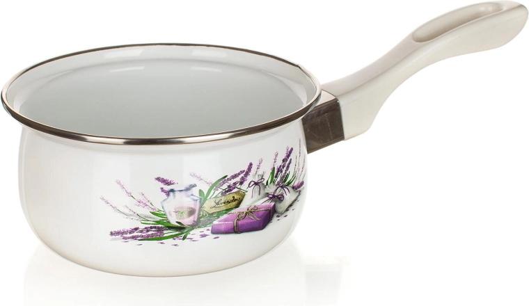 Elegant geëmailleerd steelpannetje met het motief Lavender, ideaal voor dagelijks koken en opwarmen. Biedt een inhoud van 0,65 l, een diameter van 14 cm en een lange handgreep voor veilige hantering. Dankzij het duurzame geëmailleerde oppervlak en de witte glazuur met lavendeldecor is het zowel praktisch als stijlvol. Geschikt voor alle soorten kookplaten.