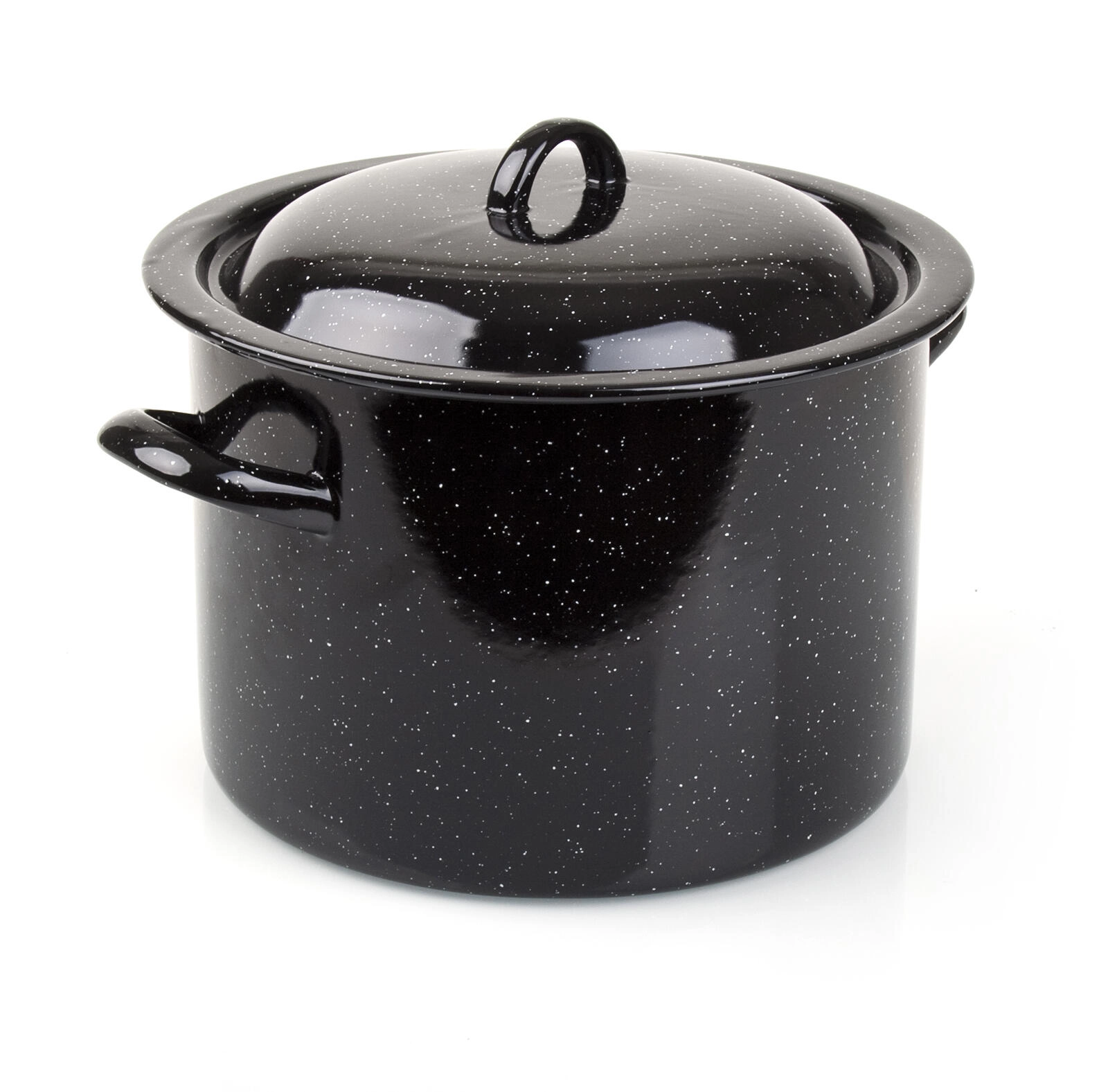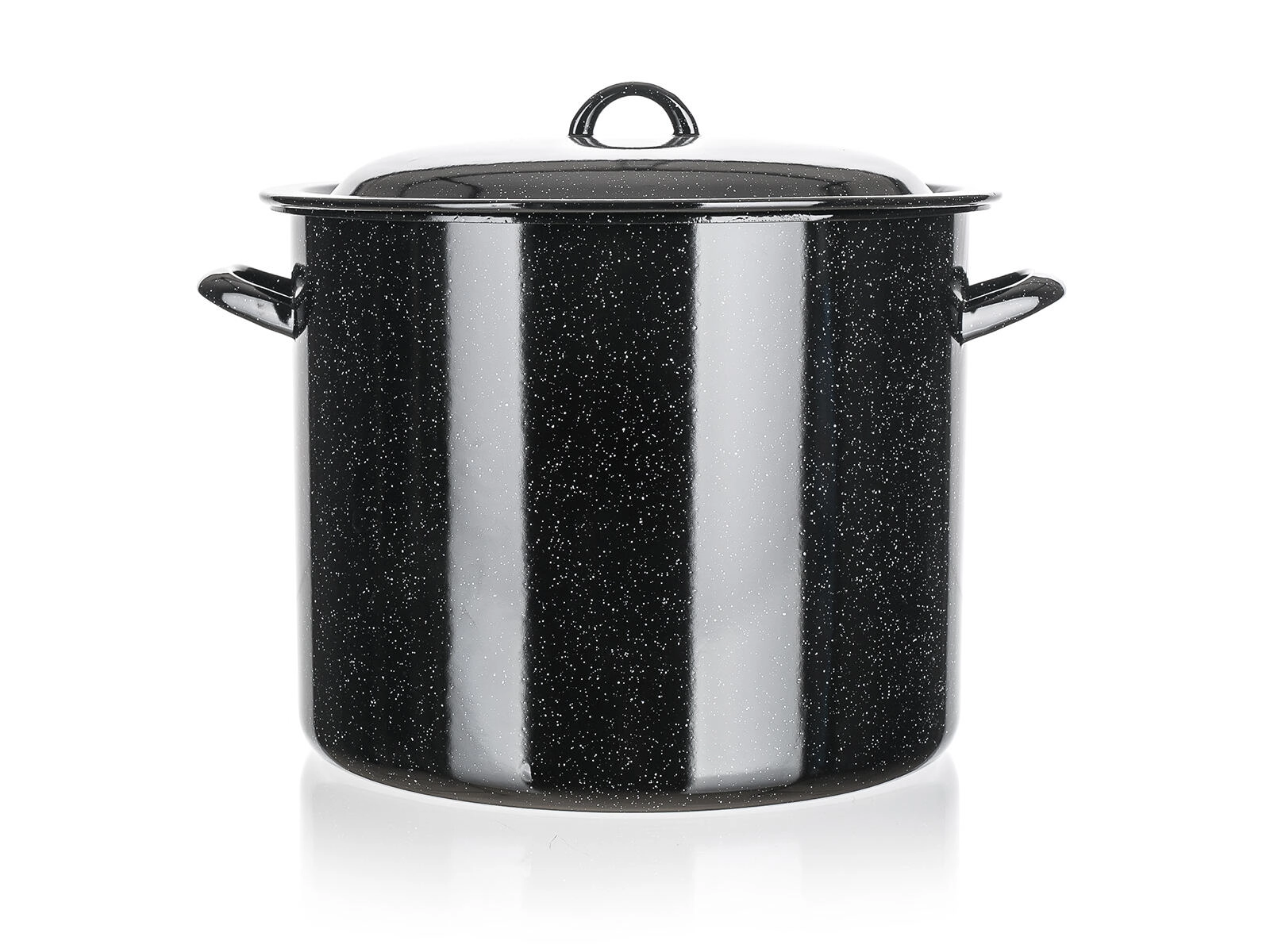 Grote geëmailleerde pan met deksel met een inhoud van 17 l en een diameter van 30 cm, ideaal voor het koken van soepen, bouillons, pasta of voor wecken. Het duurzame geëmailleerde oppervlak is makkelijk schoon te maken en verdeelt de warmte gelijkmatig. Geschikt voor alle soorten kookplaten behalve inductie.