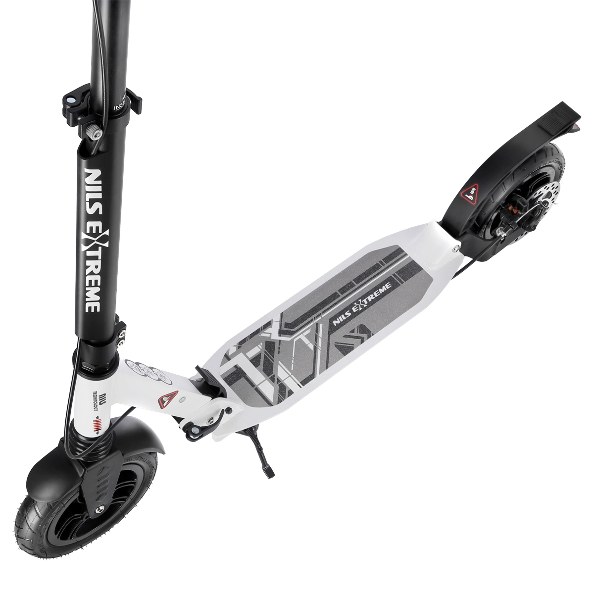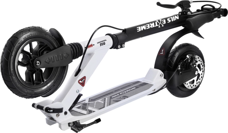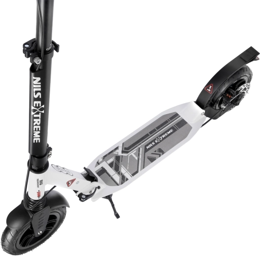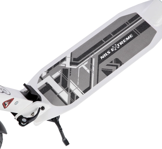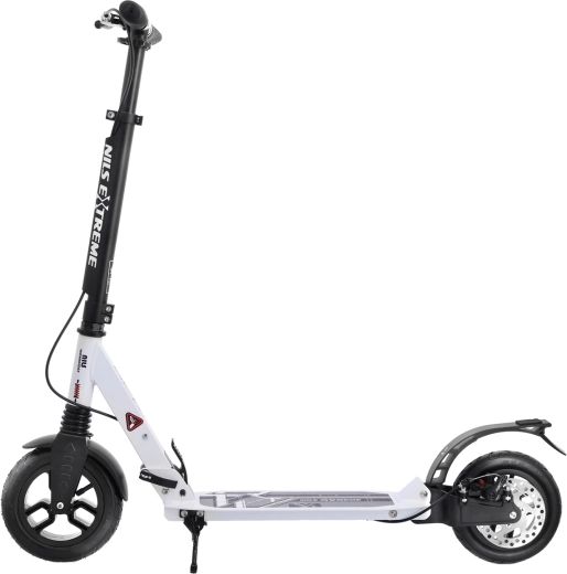 De veiligheid wordt verhoogd door de achterste schijfrem die met een hendel aan het stuur wordt bediend en aangevuld wordt met een drukspatbord. Gepompte 200 mm wielen met ABEC 9-lagers zorgen voor snelle acceleratie, stabiliteit en soepelheid. Rubber handvatten, een praktische opvouwbare standaard en een spatbord op het voorwiel maken de comfortabele uitrusting compleet.