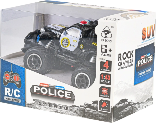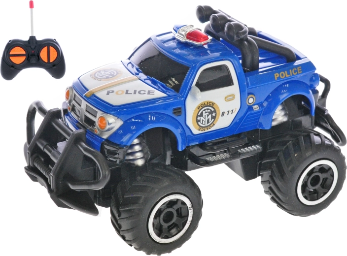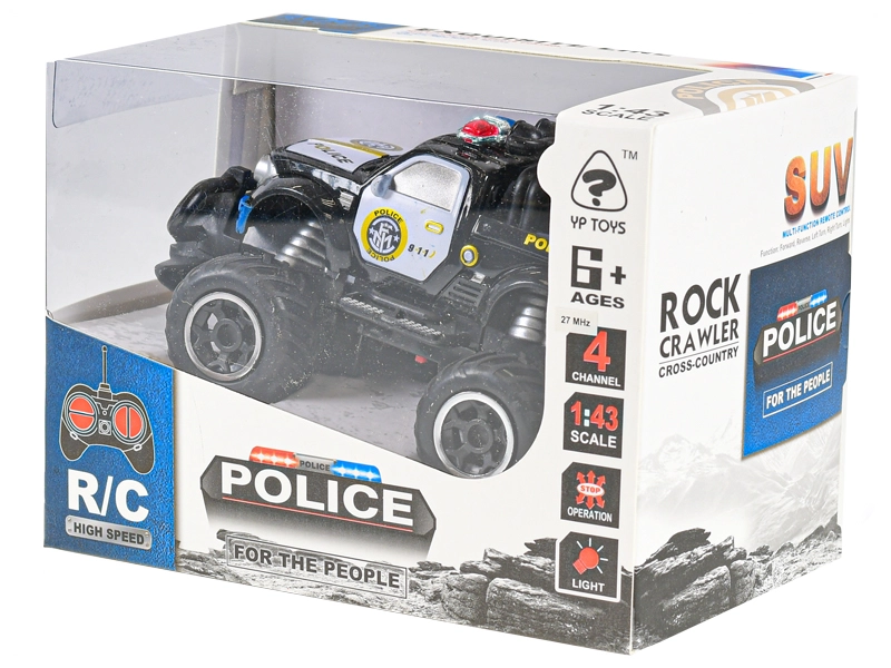 Beleef een rit vol actie met de RC politie terreinwagen van 14 cm lang. Het model op 27 MHz-frequentie biedt volledige besturingsfunctie, lichteffecten en is ideaal voor kinderen vanaf 6 jaar. Verkrijgbaar in twee kleuren – blauw en zwart.