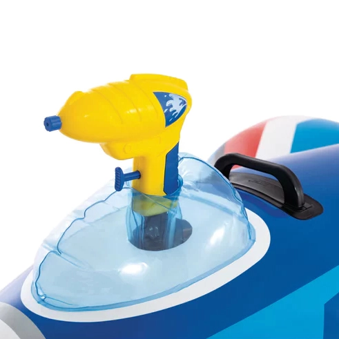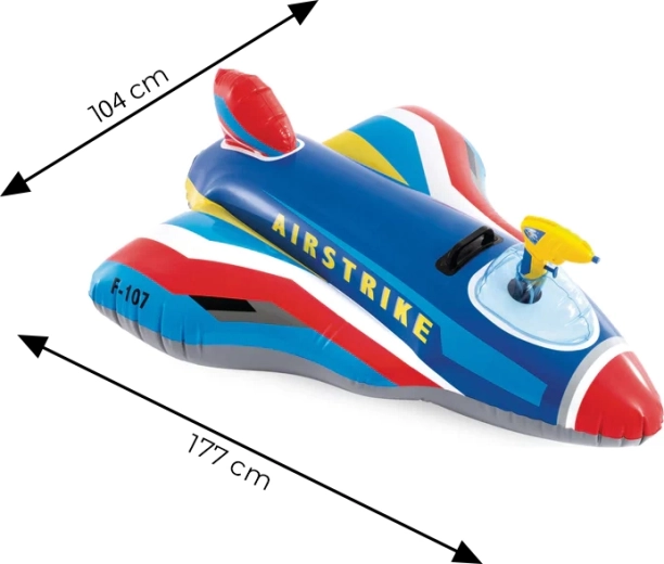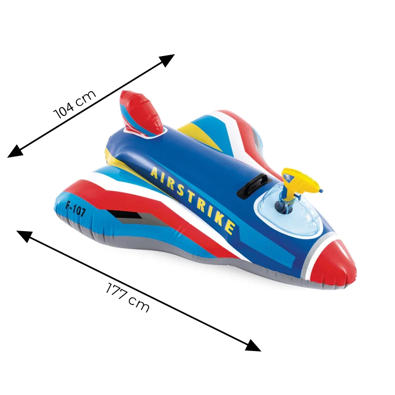 De opblaasbare gevechtsstraaljager van INTEX maakt van elk watermoment een avontuurlijke missie. Kinderen nemen plaats in de “cockpit”, grijpen de stevige handgrepen en kunnen met het geïntegreerde waterkanon een watergevecht beginnen. De brede, stabiele basis en 2 afzonderlijke luchtkamers verhogen de veiligheid en rust tijdens het spelen.