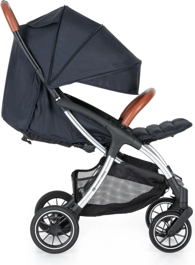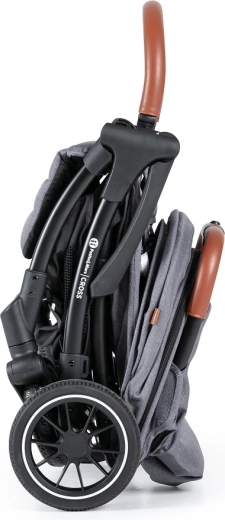Je klapt de kinderwagen met één hand uit en na gebruik vouwt hij zichzelf op tot een compact formaat; in ingeklapte toestand blijft hij zelfstandig staan. Ideaal voor in de stad, het OV en de auto.