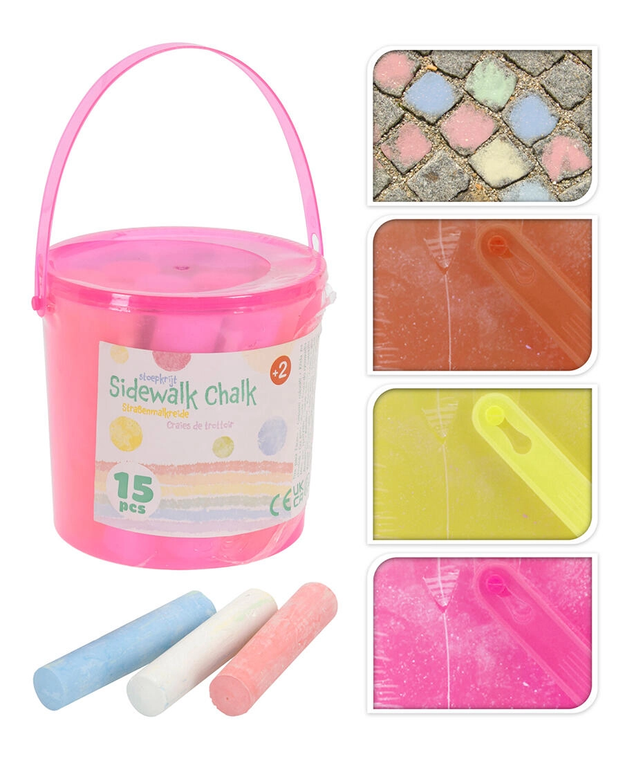 Kleurrijk stoepkrijt in een praktische plastic emmer stimuleert de creativiteit van kinderen en tovert elke stoep om tot een schildersdoek. De set bevat 15 stuks vrolijk krijt die prettig in de hand liggen, soepel tekenen en eenvoudig met water afwasbaar zijn. Ideaal voor buitenplezier, kleuterscholen, speelplaatsen en de eigen achtertuin.