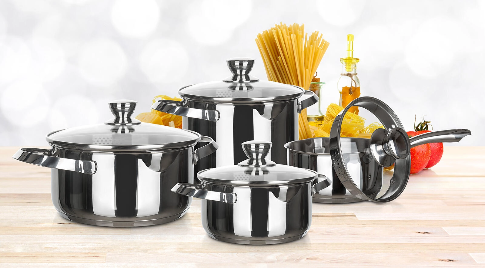 Universele RVS kookset EMBASSY met 8 delen dekt het dagelijks koken van sauzen tot soepen. Biedt glazen deksels met afgietopeningen, praktische schenkranden en interne maataanduidingen voor nauwkeurig doseren. Geschikt voor alle soorten kookplaten, inclusief inductie, met een glanzende afwerking voor een moderne look en eenvoudig onderhoud.