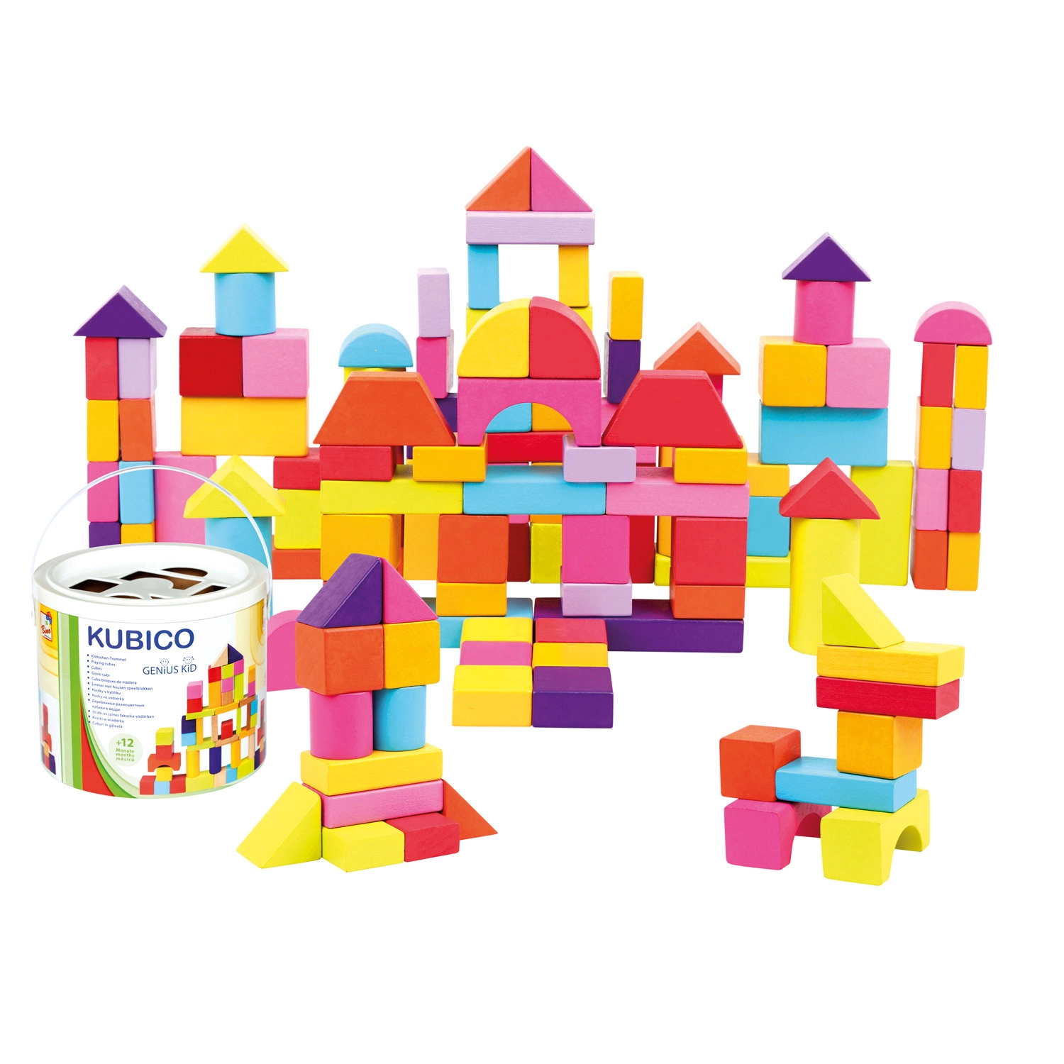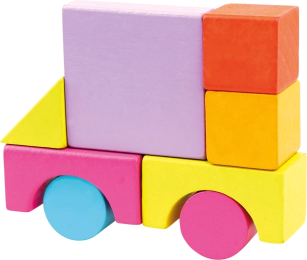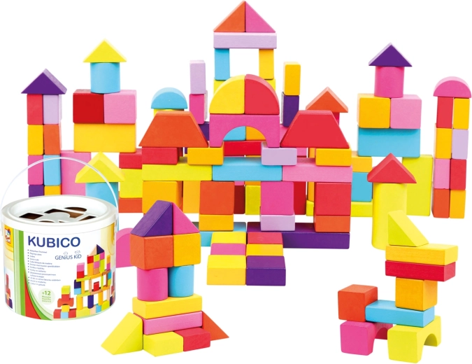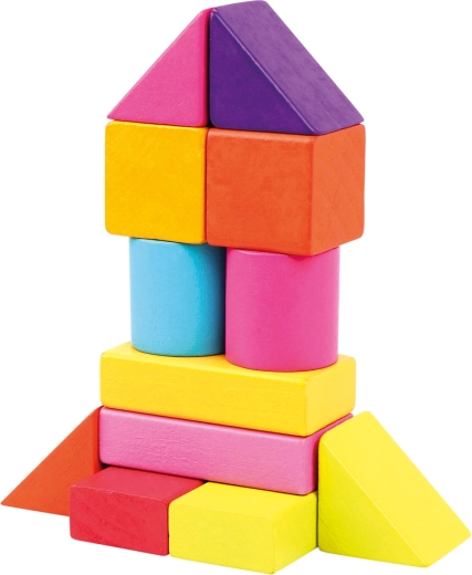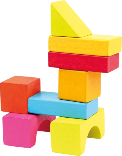 De set bevat blokken in verschillende vormen – kubussen, rechthoeken, cilinders, bogen en driehoeken – in heldere kleuren die creatief en vrij spel stimuleren.