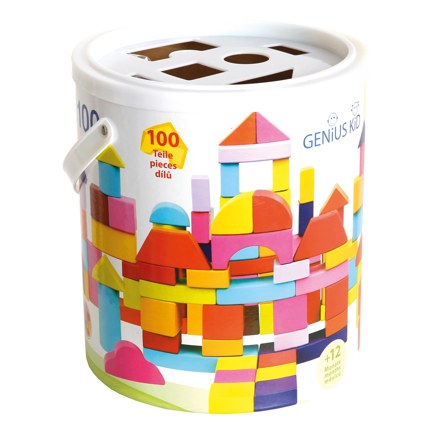 Het deksel van de emmer verandert de verpakking in een vormendoos. Zo oefenen kinderen spelenderwijs vormherkenning, coördinatie en logisch denken tijdens het opruimen van de blokken.