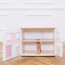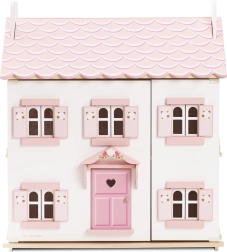 Luxueus drie verdiepingen tellend huis in romantisch roze-witte uitvoering met een glanzend gegolfd dak, hartjes en kleurrijke interieurdecoraties in elke kamer. Openslaande ramen en luiken nodigen kinderen uit in een wereld vol verhalen, terwijl de stabiele houten constructie een lange levensduur verzekert. Het poppenhuis wordt geleverd zonder inrichting, zodat kinderen het kunnen aankleden met meubels en figuren naar hun eigen stijl.