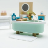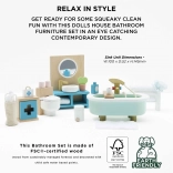 Stijlvolle set badkamermeubilair voor een poppenhuis op schaal 1:12 van het merk LE TOY VAN. Bevat een bad, toilet, wastafel, handdoekenrek en medicijnkastje, met de hand nabewerkt met niet-giftige verf op waterbasis. Gemaakt ethisch van duurzame materialen, ondersteunt creatief spel, communicatieve vaardigheden en coördinatie.