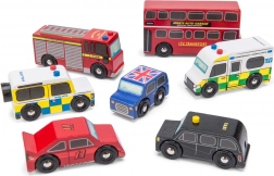 Ontdek de wereld van de drukke Londense straten met gedetailleerde houten voertuigen van Le Toy Van. De set bevat een dubbeldekkerbus, een zwarte taxi, een brandweerauto, een ambulance, een politiewagen en twee personenauto’s. De robuuste uitvoering van duurzaam rubberhout en de afgeronde randen zijn ideaal voor kleine kinderhanden, die tijdens het spelen hun grijpkracht, hand-oogcoördinatie en verbeelding oefenen.