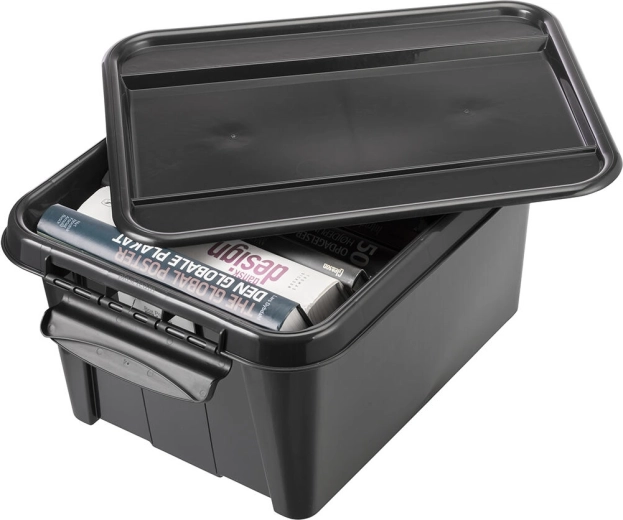 Praktische opbergbox van 32 l met stevig deksel en twee grote clips voor een veilige afsluiting. Gemaakt van gerecycled PP, is hij duurzaam, stapelbaar en ideaal voor overzichtelijke opslag thuis, op kantoor en in de garage.